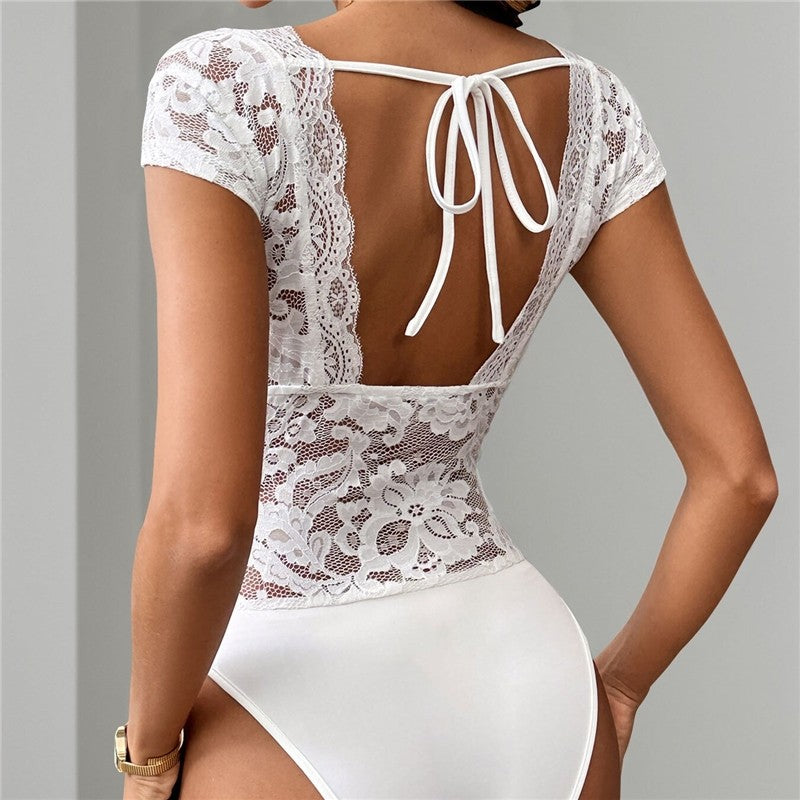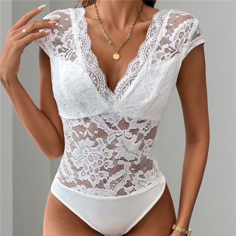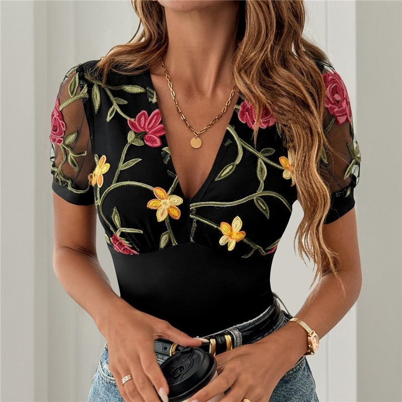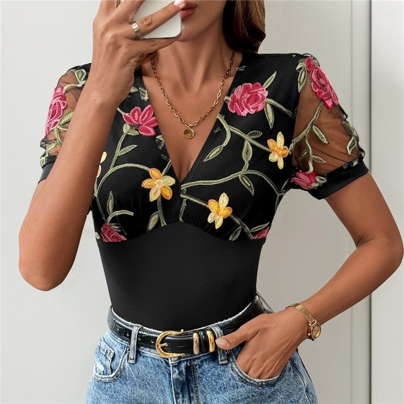 V-Neck Mesh Floral Short Sleeve Patchwork Jumpsuit