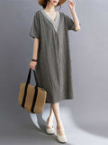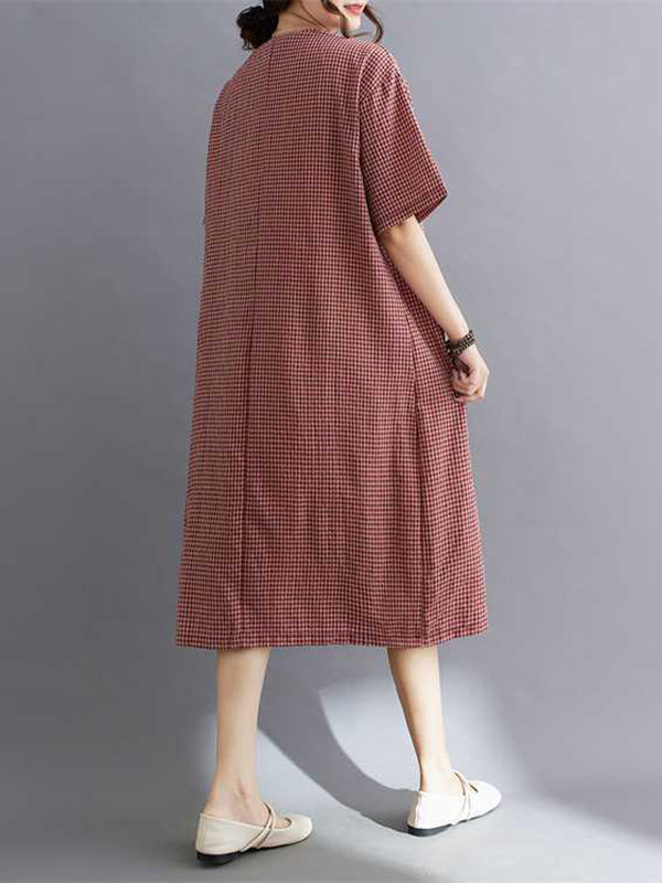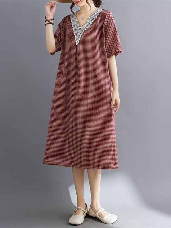 A-Line Half Sleeves Plaid Pleated Split-Joint V-Neck Midi Dresses
