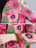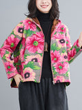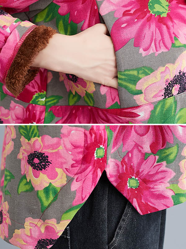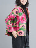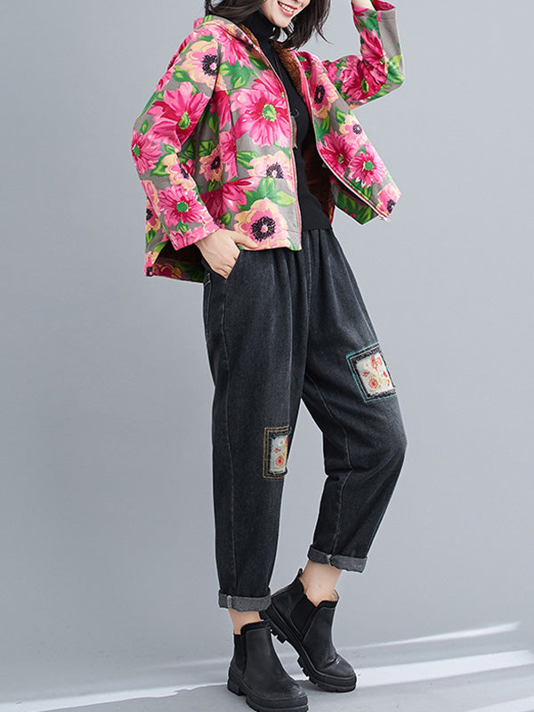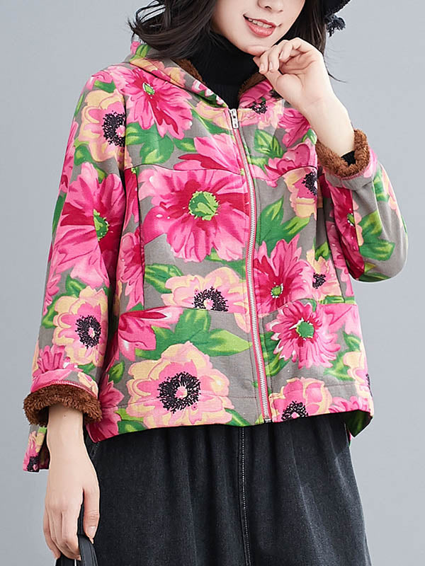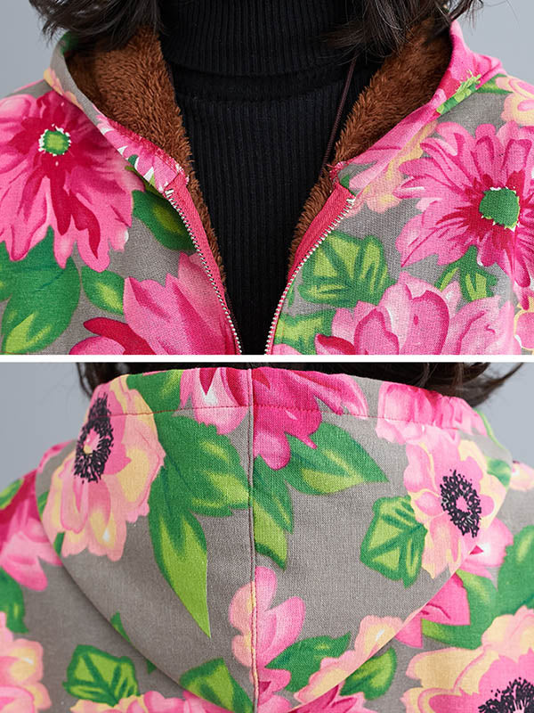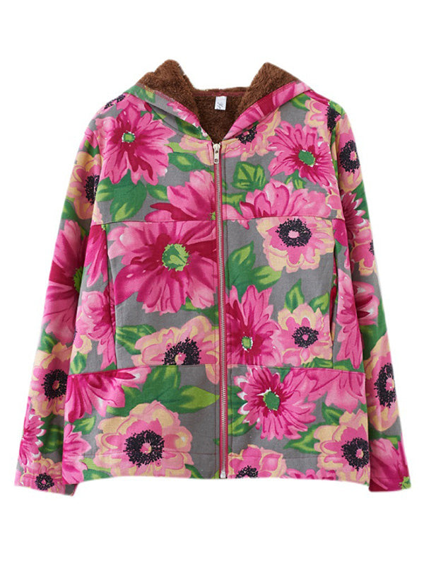Artistic Retro Velvet Floral Printed Zipper Hooded Long Sleeves Outwear