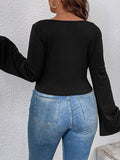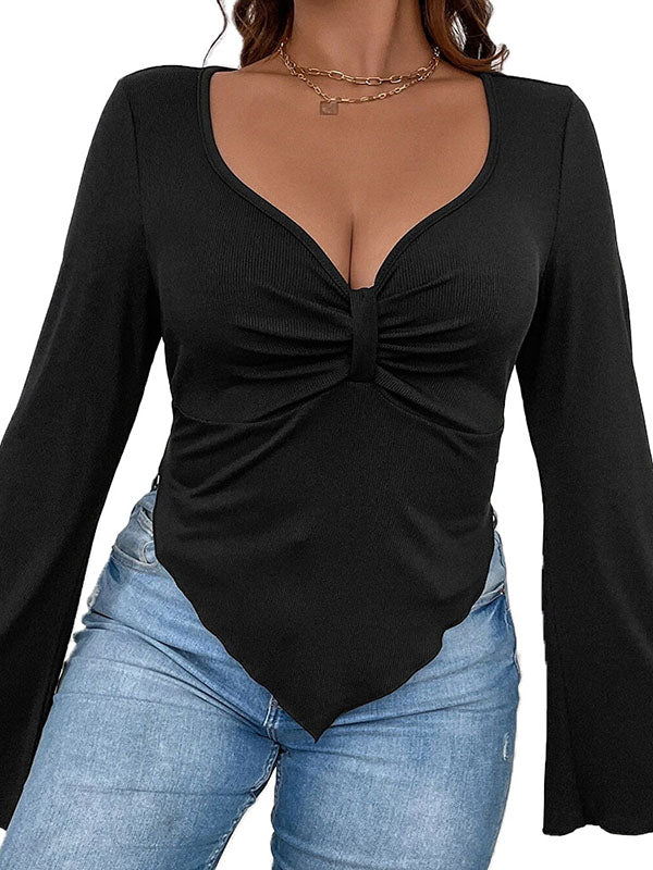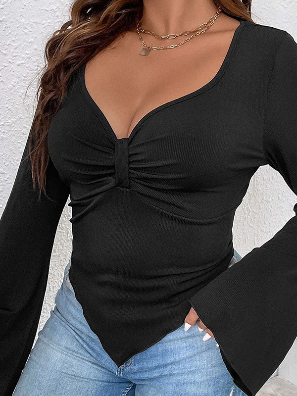 Flared Sleeves Long Sleeves Pleated Solid Color Deep V-Neck T-Shirts Tops