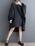 High-Low Long Sleeves Elasticity Solid Color Split-Joint Round-Neck Midi Dresses
