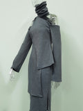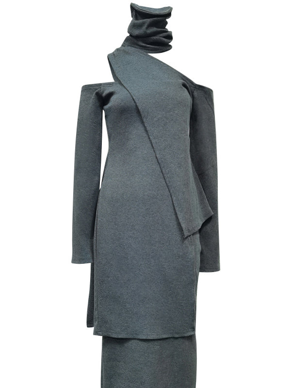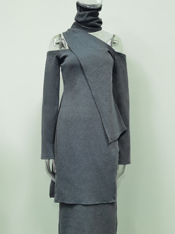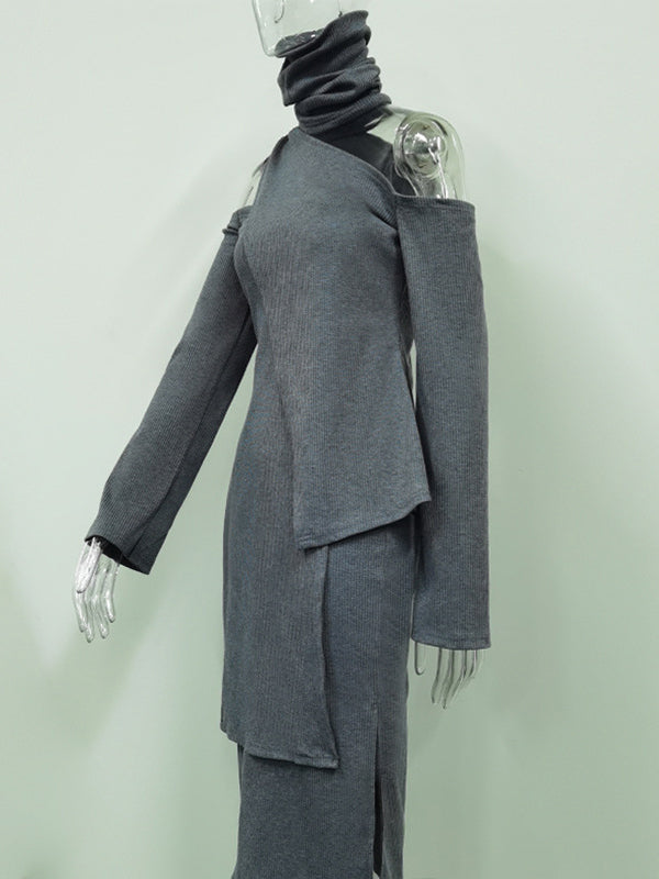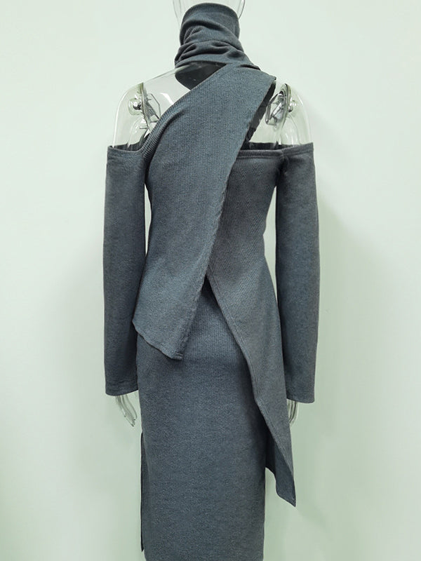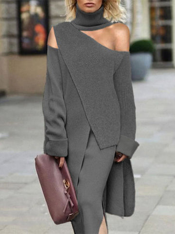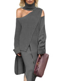 Irregularity Solid Color Split-Front Cold Shoulder Sweater Tops& Skirts Two Pieces Set