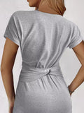 Raglan Sleeve Skinny Buttoned Knot Pleated Solid Color Round-Neck T-Shirts Tops