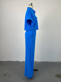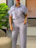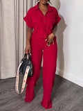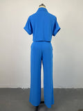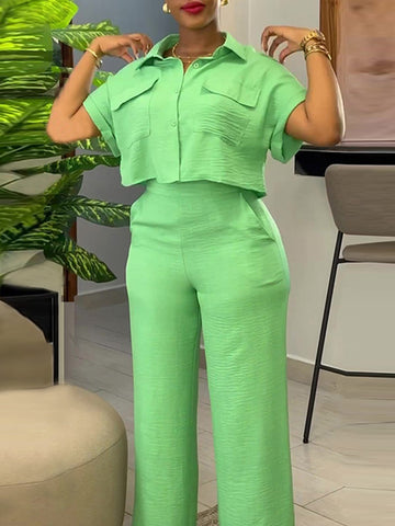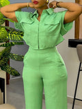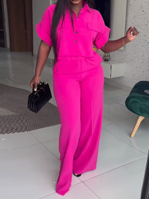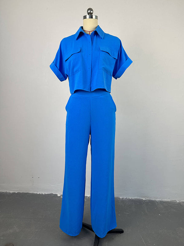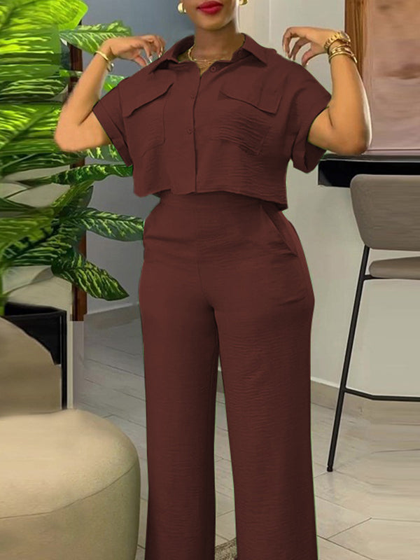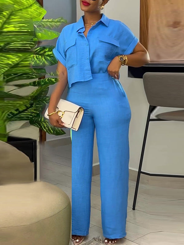 Wrap Buttoned Pockets Solid Color Shirts Tops&Pants Suits